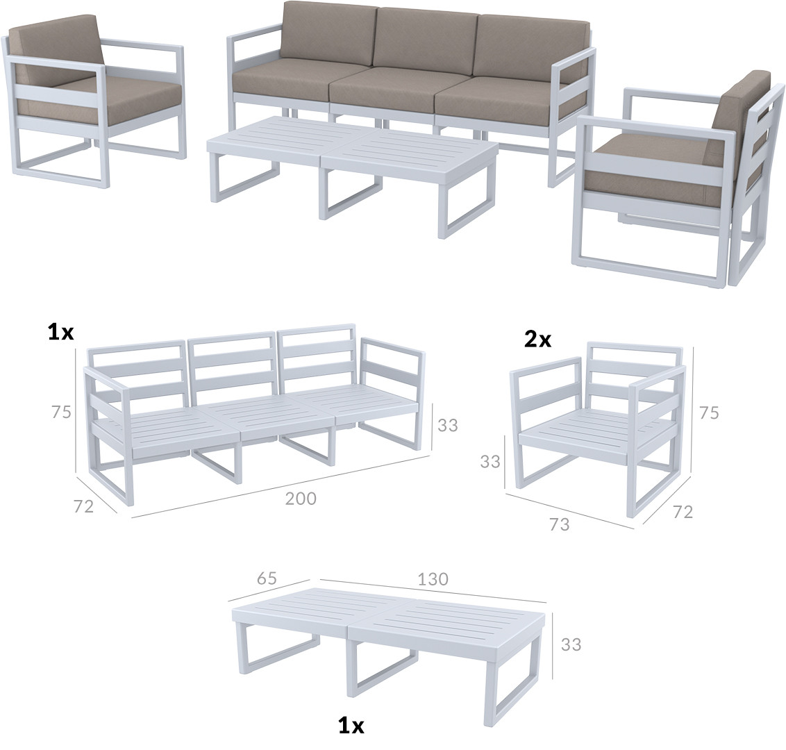 The Mykonos Lounge Set XL is a modern, modular outdoor seating solution that combines comfort, durability, and contemporary design. Made from weather-resistant resin reinforced with glass fiber, this set is built to endure the elements without fading, rusting, or deteriorating—making it ideal for both indoor and outdoor contract use in residential, hospitality, or commercial settings.